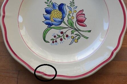 コンディション : 経年による、シミ、キズ、汚れ、貫入などあり、リムのレッドのラインに製造時のヨリが3か所(写真2,3)あります。又、リムに窯キズの間に極小さなカケ(写真5左から2つ目〇)があり、因みに一番左〇と一番右〇、右から2番目〇は窯キズです。尚、写真4は窯キズがカケになっています。全体的には大変綺麗で良好と思います