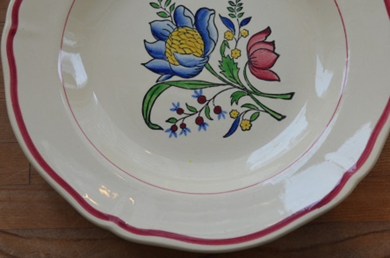 カラー : 薄いベージュ地にブルー、ダークピンク、イエローのフラワー柄、葉はグリーン、リムにダークピンクのラインで花リム