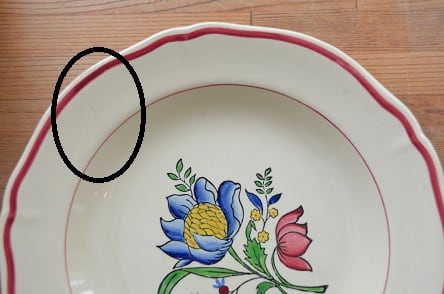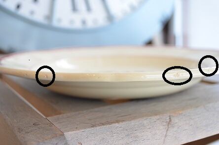 コンディション : 経年による、シミ、キズ、汚れ、貫入などあり、リムに窯キズ以外にカケ(写真4)が3か所あります。又、リムから内側に向かって3.5cm程のヒビ(写真2)が見られます。全体的には大変綺麗で良好と思います