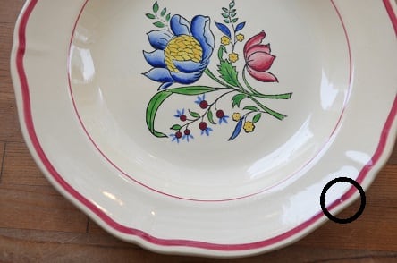 コンディション : 経年による、シミ、キズ、汚れ、貫入などあり、リムにカケ(写真4左と中央〇)(写真5左〇)がありますが、このうち窯キズが写真4右〇と写真5右〇かと思います。又、写真3は製造時に付いたものです。全体的には大変綺麗で良好と思います