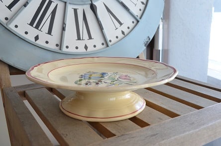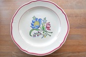 カラー : 薄いベージュ地にブルー、ダークピンク、イエローのフラワー柄、葉はグリーン、リムにダークピンクのラインで花リム