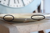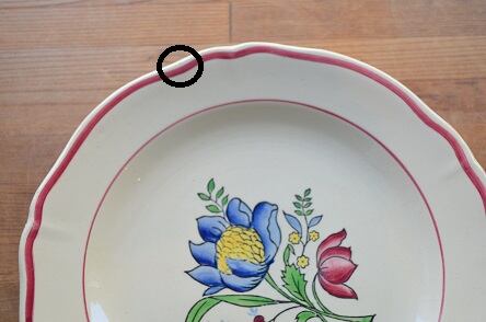 コンディション : 経年による、シミ、キズ、汚れ、貫入などあり、リムにカケがあります。写真4のリムのカケは左〇はカケ、右〇は窯キズがカケになったものと思われます。又、写真5の〇は、右側は窯キズで左側がカケです。尚、表面にも極小さなカケ(写真2)があります。全体的には大変綺麗で良好と思います