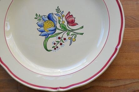 カラー : 薄いベージュ地にブルー、ダークピンク、イエローのフラワー柄、葉はグリーン、リムにダークピンクのラインで花リム