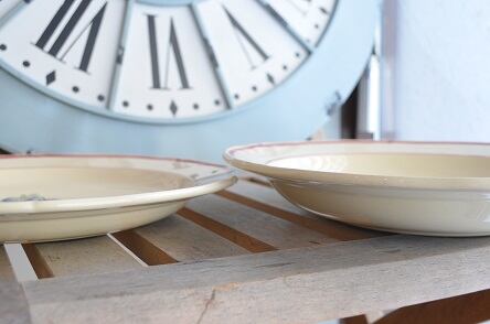 コンディション : 経年による、シミ、キズ、汚れ、貫入などあり、リムの窯キズの左右に擦れ感(写真3)があります。又、写真はありませんが、裏側リムに製造時に付いたキズに釉薬を塗った部分がありますが、こちらは気にならないと思います。全体的には大変綺麗で良好と思います。尚、写真4は、サラダプレートGIFH(右)と写しています