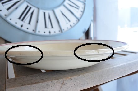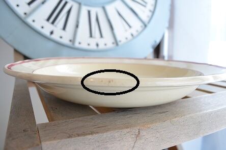コンディション : 経年による、シミ、キズ、汚れ、貫入などあり、リムの窯キズの左右に製造時に付いたと思われる極小さなカケの様なキズ(写真3,4)があります。又、裏側のリムにも極小さなカケ(写真5)が3か所程ありますが、こちらは目立たないと思います。全体的には大変綺麗で良好と思います。尚、サラダプレートGIFLをご覧になると、サラダプレートGIFLとの高さの違いがわかる写真がございます