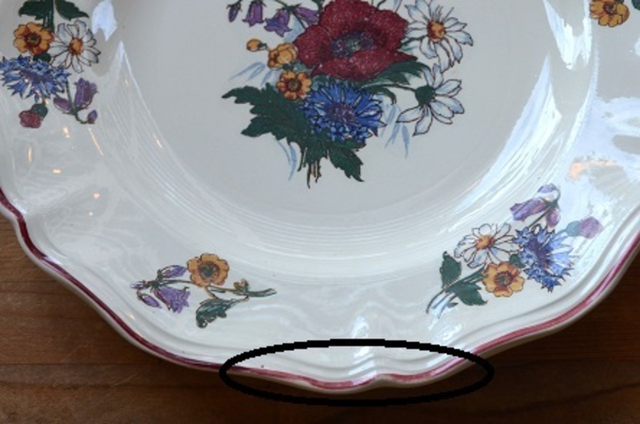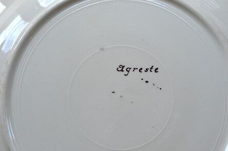 コンディション : 経年による、シミ、キズ、汚れ、貫入などあり、裏側リムに小さなカケが2か所(写真4)あります。又、表面のリムのレッドのラインに若干の擦れ感(写真3)があります。全体的には大変綺麗で良好と思います。尚、バックスタンプですが、SarregueminesはなくAgresteのみです。又、フラワーの絵柄部分に、製造時に付いた気泡が若干見られます