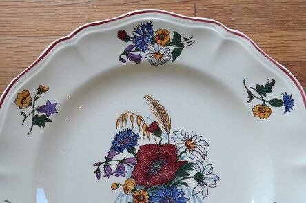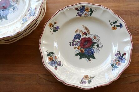 カラー : アイヴォリー地にフランスの国旗のトリコロールの花、矢車菊(ブルー)、マーガレット(ホワイト)、ひなげし;ポピー(レッド)を中心に、ホタルブクロ;釣鐘草(パープル)、麦(イエロー)とキンポウゲ(?)(イエロー)が描かれています。又、花リムの内側にレッドのラインが入っています