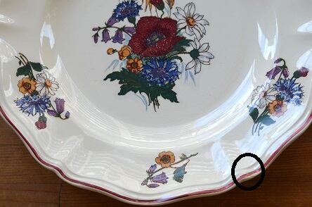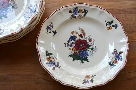 カラー : アイヴォリー地に、フランスの国旗のトリコロールの花、矢車菊(ブルー)、マーガレット(ホワイト)、ひなげし;ポピー(レッド)を中心に、ホタルブクロ;釣鐘草(パープル)、麦(イエロー)とキンポウゲ(?)(イエロー)が描かれています。又、花リムの内側にレッドのラインが入っています