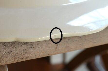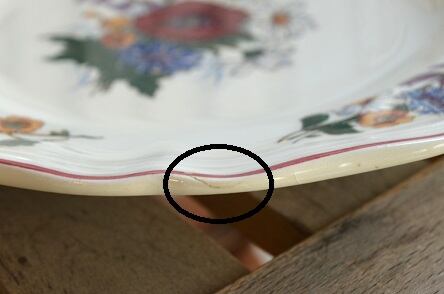 コンディション : 経年による、シミ、キズ、汚れ、貫入などあり、表面のリムのレッドのラインに3か所極小さなカケ(写真2)があります。又、表面のリムにカケ(写真3)があり、そこから側面にかけて1.2cm程のヒビ(写真4)になっています。又、裏側のリムにカケ(写真5)があります。全体的には綺麗で良好と思います。尚、フラワーの絵柄部分に、製造時に付いた気泡が若干見られます