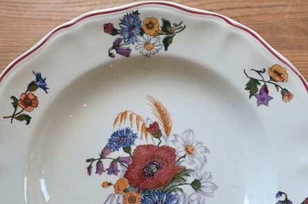 カラー : アイヴォリー地に、フランスの国旗のトリコロールの花、矢車菊(ブルー)、マーガレット(ホワイト)、ひなげし;ポピー(レッド)を中心に、ホタルブクロ;釣鐘草(パープル)、麦(イエロー)とキンポウゲ(?)(イエロー)が描かれています。又、花リムの内側にレッドのラインが入っています