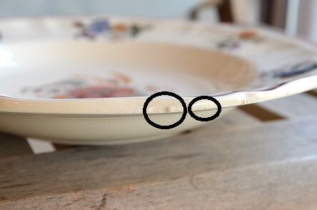 コンディション : 経年による、シミ、キズ、汚れ、貫入などあり、裏側リムにカケが2か所(写真4)あり、その内の1か所(写真4左〇)は少し気になるかもしれません。又、写真はありませんが、リムに極小さなカケが2か所ありますが、こちらは目立たないと思います。尚、表面に製造時に付いた0.5cm程のキズ(写真3)があります。全体的には良好と思いますが、カケが気になる方はご遠慮ください