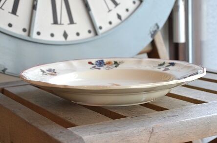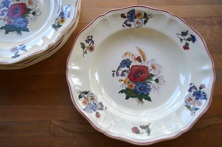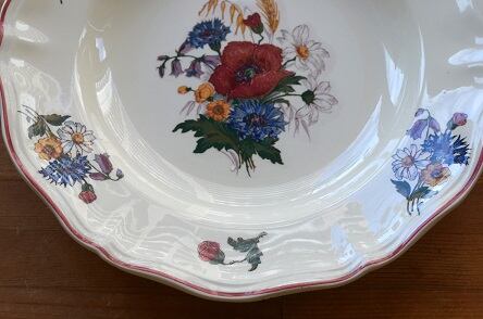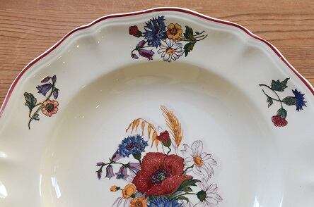 カラー : アイヴォリー地に、フランスの国旗のトリコロールの花、矢車菊(ブルー)、マーガレット(ホワイト)、ひなげし;ポピー(レッド)を中心に、ホタルブクロ;釣鐘草(パープル)、麦(イエロー)とキンポウゲ(?)(イエロー)が描かれています。又、花リムの内側にレッドのラインが入っています