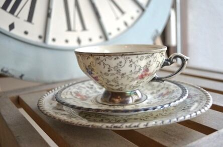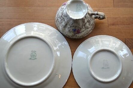 コンディション : 経年による、シミ、キズ、汚れなどありますが、目立ったカケなどはありません。但し、カップ&ソーサーやケーキPのリムやカップ持ち手、カップ下部などのダークグレーの部分(写真2,3)が色が薄くなっています。全体的には良好と思います