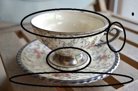 カラー : カップの外側、ソーサー、ケーキPはホワイト地にシルバーの模様にピンクのバラをはじめとしたフラワーとオレンジのフラワー。ソーサーのリムにはダークグレー、ケーキPのリムにはホワイトとダークグレーの模様。カップの下部と持ち手はダークグレー、カップ上部リムと内側にダークグレーのライン
