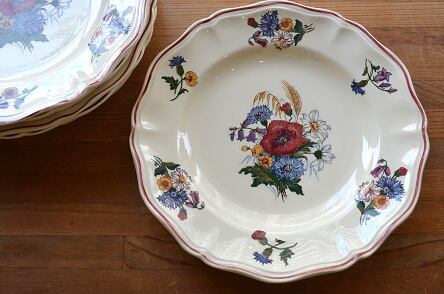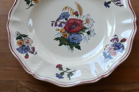 カラー : アイヴォリー地に、フランスの国旗のトリコロールの花、矢車菊(ブルー)、マーガレット(ホワイト)、ひなげし:ポピー(レッド)を中心に、ホタルブクロ;釣鐘草(パープル)、麦(イエロー)とキンポウゲ(?)(イエロー)が描かれています。又、花リムの内側にレッドのラインが入っています