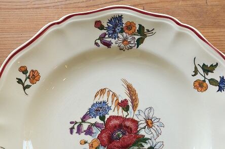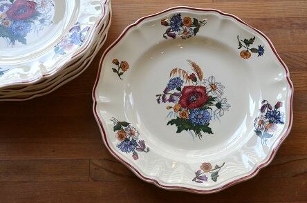 カラー : アイヴォリー地に、フランスの国旗のトリコロールの花、矢車菊(ブルー)、マーガレット(ホワイト)、ひなげし;ポピー(レッド)を中心に、ホタルブクロ;釣鐘草(パープル)、麦(イエロー)とキンポウゲ(?)(イエロー)が描かれています。又、花リムの内側にレッドのラインが入っています