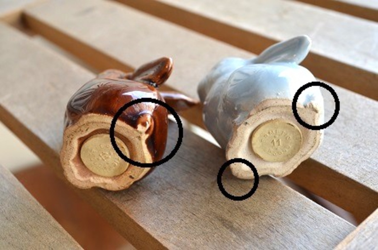 コンディション : 経年による、シミ、キズ、汚れ、貫入などあり、ブラウンのウサギの耳の先にカケ(写真4左〇)があり、ブルーグレーのウサギの耳にも極小さなカケ(写真4中央と右〇)があります。ブルーグレーのウサギの底部リムに極小さなカケ(写真5中央〇)がありますが、目立たないと思います。又、それぞれの底のリムの擦れ感やシッポの先がカケの様に見えるのは(写真5左右〇)、製造時の塗り残しと思います。いずれもそれ程目立たないと思います。尚、底の樹脂の蓋(写真5)は硬くなっていて、取ると破損しそうで試していません。オブジェとして飾ってください。全体的には大変かわいらしく、レアで良好と思います。