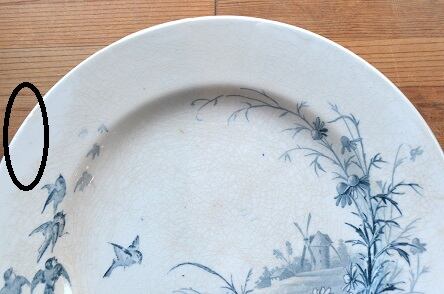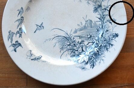 コンディション : 経年による、シミ、キズ、汚れ、貫入などあり、特に貫入が全体に広がってブラウンがかっています。又、リムの窯キズの隣にカケ(写真4)がある他、リムに2か所程カケ(写真2)が見られますが、あまり目立たないと思います。尚、リムにヒビが2か所(写真3)あり、1か所は裏側まで通しています。全体的には悪くはないと思います