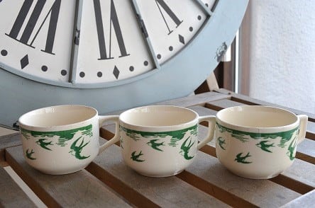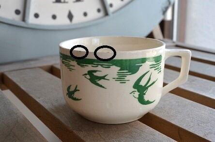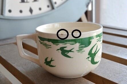 コンディション : 経年による、シミ、キズ、汚れ、貫入などあり、リムに数か所カケ(写真2,3,4)があります。又、写真はありませんが、持ち手内側に製造時に付いた突起がありますが、それ程気にならないと思います。全体的にはカケなどありますが、人気のツバメ柄で、グリーンは比較的レアなので、悪くはないかと思います