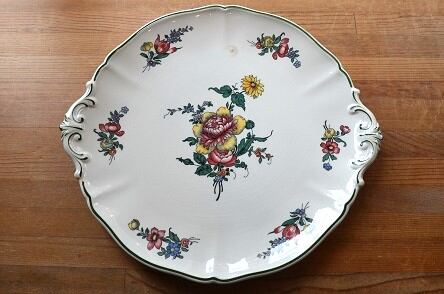 カラー : アイヴォリー地にイエロー、ダークピンク、ブルーのフラワー柄、葉はグリーン、リムもグリーン