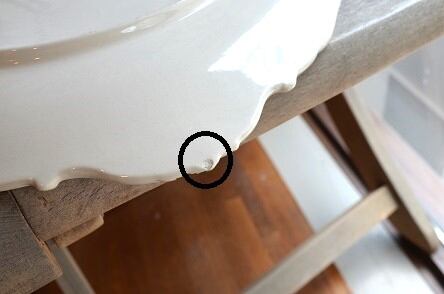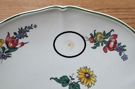 コンディション : 経年による、シミ、キズ、汚れ、貫入などあり、表面に製造時に付いた穴があり、そこからシミ1.3×1.5cm程(写真3)が広がっています。又、持ち手の裏側に1か所カケ(写真4)がありますが、こちらはそれ程気にならないと思います。全体的には大変良好と思います