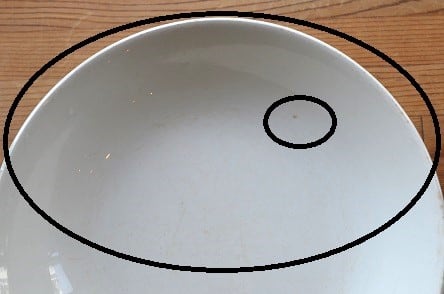 コンディション : 経年による、シミ、キズ、汚れ、貫入などあり、リムに窯キズ以外に極小さなカケ(写真4)が数か所あります。又、表面に製造時に付いた凸(写真2内〇)があります。尚、リム全体に擦れ感(写真2外〇と写真3)があり、茶色く変色しています。全体的には良好と思います