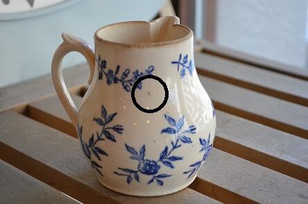 コンディション : 経年による、シミ、キズ、汚れ、貫入などあり、目立ったカケはありませんが、上部リムに擦れ感(写真3)があります。又、製造時に付いた突起(写真2)があり、写真はありませんが、底にも1か所あります。ただ、底部分が擦れている為、問題ないと思います。尚、持ち手に1か所、外側から内側迄通ったヒビ(写真4,5)があり、現段階では大丈夫ですが、割れる恐れがありますのでご注意ください。全体的には良好でレアなかわいらしいピッチャーと思いますが、気になる方はご遠慮ください