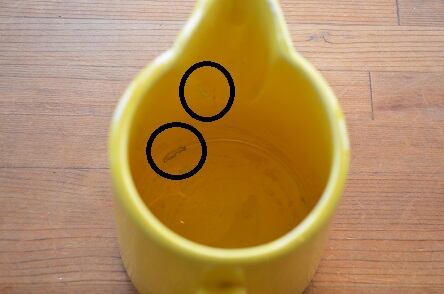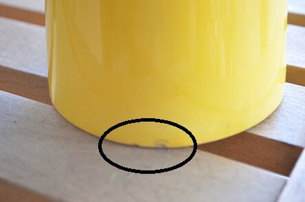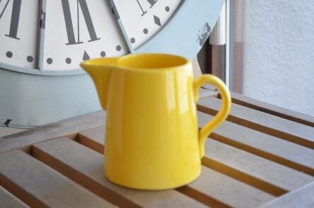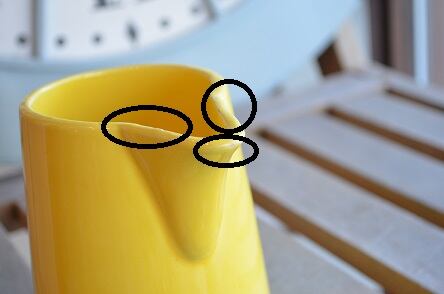 コンディション : 経年による、シミ、キズ、汚れ、貫入などあり、上部リムに数か所(写真2)、下部リムにも2か所(写真3)カケがあります。又、持ち手には3cm程のカケ(写真4)がありますが、何れもそれ程気にならないと思います。尚、内側2か所のカケ(写真5)は液体を入れると染みるかもしれません。全体的にはとてもかわいらしいレモンイエローのピシェです