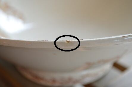 コンディション : 経年による、シミ、キズ、汚れ、貫入などありますが、リムに1か所カケ(写真4)があり、その周りがシミで若干茶色に変色しています。又、リムにある黒い点(写真3)は製造時に付いたものです。全体的に大変綺麗で良好と思います