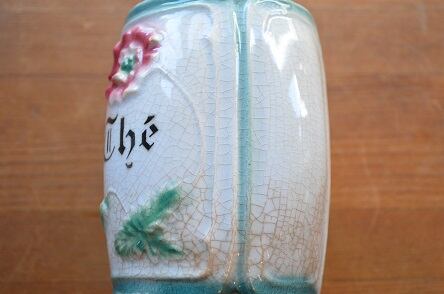 コンディション : 経年による、シミ、キズ、汚れ、貫入などあり、特に下部の貫入にシミが入って茶色くなっています。尚、底のリムにカケ(写真5)があり、又、製造時に付いた濃い茶色の部分(写真3,4)がありますが、これらは気にならないと思います。全体的には他に目立ったカケはなく、かわいらしいキャニスターと思います