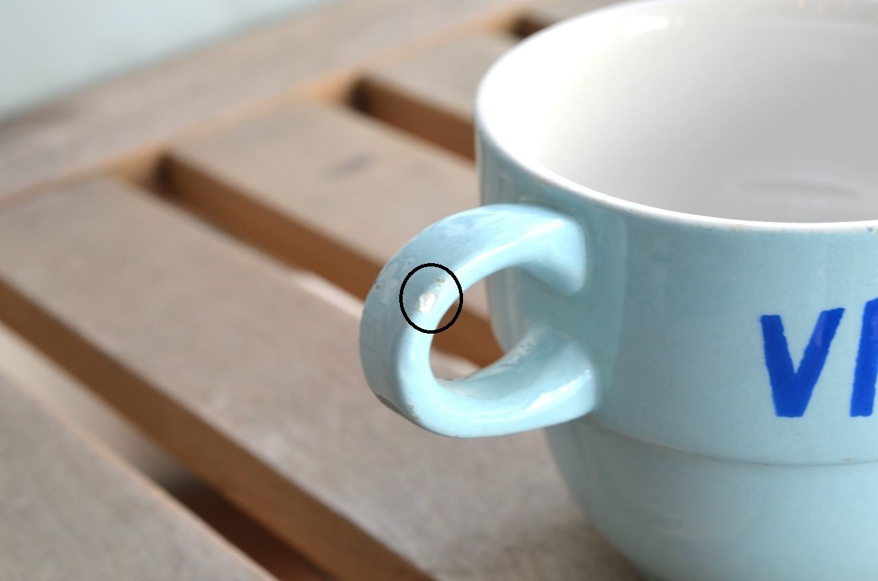 コンディション : 経年による、シミ、キズ、汚れ、貫入などあり、カケはリム(写真5~7〇)や持ち手(写真8~10)に無数にあり、写真7の△は製造時に付いたカケです。尚、裏側の底部分は極小さなカケが1か所あり、又、若干のザラつきがありますが、それ程深刻ではないと思います。カケが気になる方はご遠慮ください。
