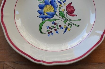 カラー : 薄いベージュ地にブルー、ダークピンク、イエローのフラワー柄、葉はグリーン、リムにダークピンクのラインで花リム