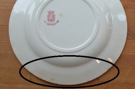 コンディション : 経年による、シミ、キズ、汚れ、貫入などあります。特に裏側リムにシミが広がってる部分(擦れた部分にシミがはいったのか、もしくは製造時のものかわかりかねます)(写真4,5)があり、製造時に付いたカケに釉薬(写真4)を塗った部分もありますが、表面からはわからないと思います。全体的には大変綺麗で良好と思います