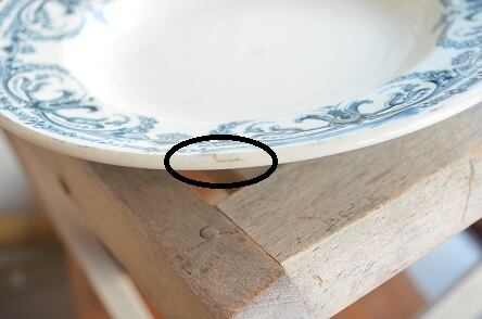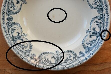 コンディション : 経年による、シミ(写真3中〇)、キズ、汚れ、貫入などあり、リムに1.0cm程のカケ(写真4)があり引っ掛かりがあります。又、窯キズ以外にもリムに数か所カケ(写真3左右下〇)があり、リムに若干の擦れ感もあり、リム裏側にも極小さなカケがあります。尚、写真2は、色が滲んだ上に厚く釉薬をかけていて膨らんでいます。全体的には悪くはないと思います