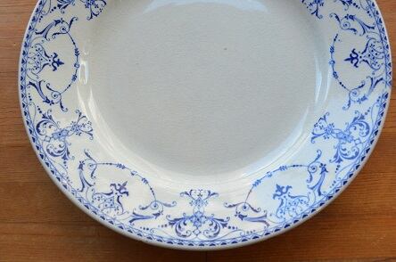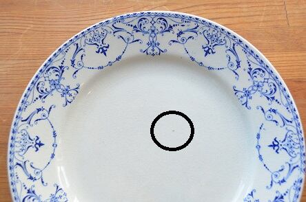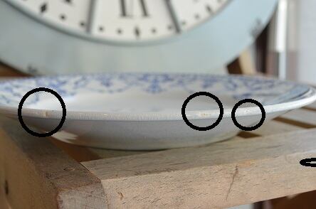 コンディション : 経年による、シミ(写真2)、キズ、汚れ、貫入などあります。又、リムにカケ(写真4)があり、写真はありませんが1か所極小さなカケもあります。全体的には良好で、とても素敵なプレートと思います