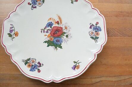 カラー : アイヴォリー地にフランス国旗のトリコロールの花、矢車菊(ブルー)、マーガレット(ホワイト)、ひなげし(レッド)を中心に、ホタルブクロ:釣鐘草(パープル)、麦(イエロー)とキンポウゲ(?)(イエロー)の野花が描かれています。又、花リムの内側にはレッドのラインが入っています