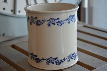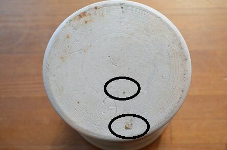 コンディション : 経年による、シミ、キズ、汚れ、貫入などあり、目立ったカケはありませんが、製造時に付いた小さな穴(写真2)が数か所あります。又、上部リムが蓋との接触の為か擦れ感(写真4)があります。尚、底部に2か所凸(写真5)があり、置く場所によっては、キズがつく恐れがあります(その部分だけ若干上がっていて、平面に置いた時接触しませんが、念の為)。全体的にはレアで大変良好なキャニスターと思います。蓋はありませんが、ツールポットなどにいかがでしょうか。硬質ですので、少し重めです