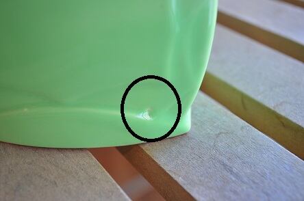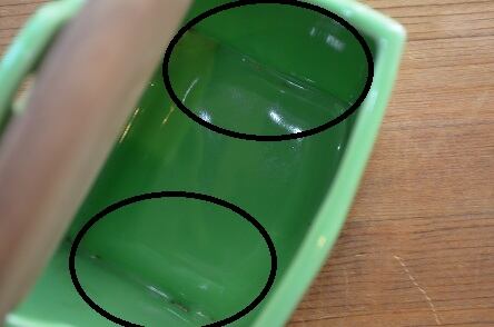 コンディション : 経年による、シミ、キズ、汚れ、貫入などありますが、製造時の色や釉薬の塗り残し(写真3)があり、画像はありませんが、後ろ側のフックなどに掛ける穴の部分にも塗り残しがあります。又、内側の底の部分にも塗り残し(写真5)がありますが、目立ったカケは見られません。全体的に大変綺麗で良好と思います
