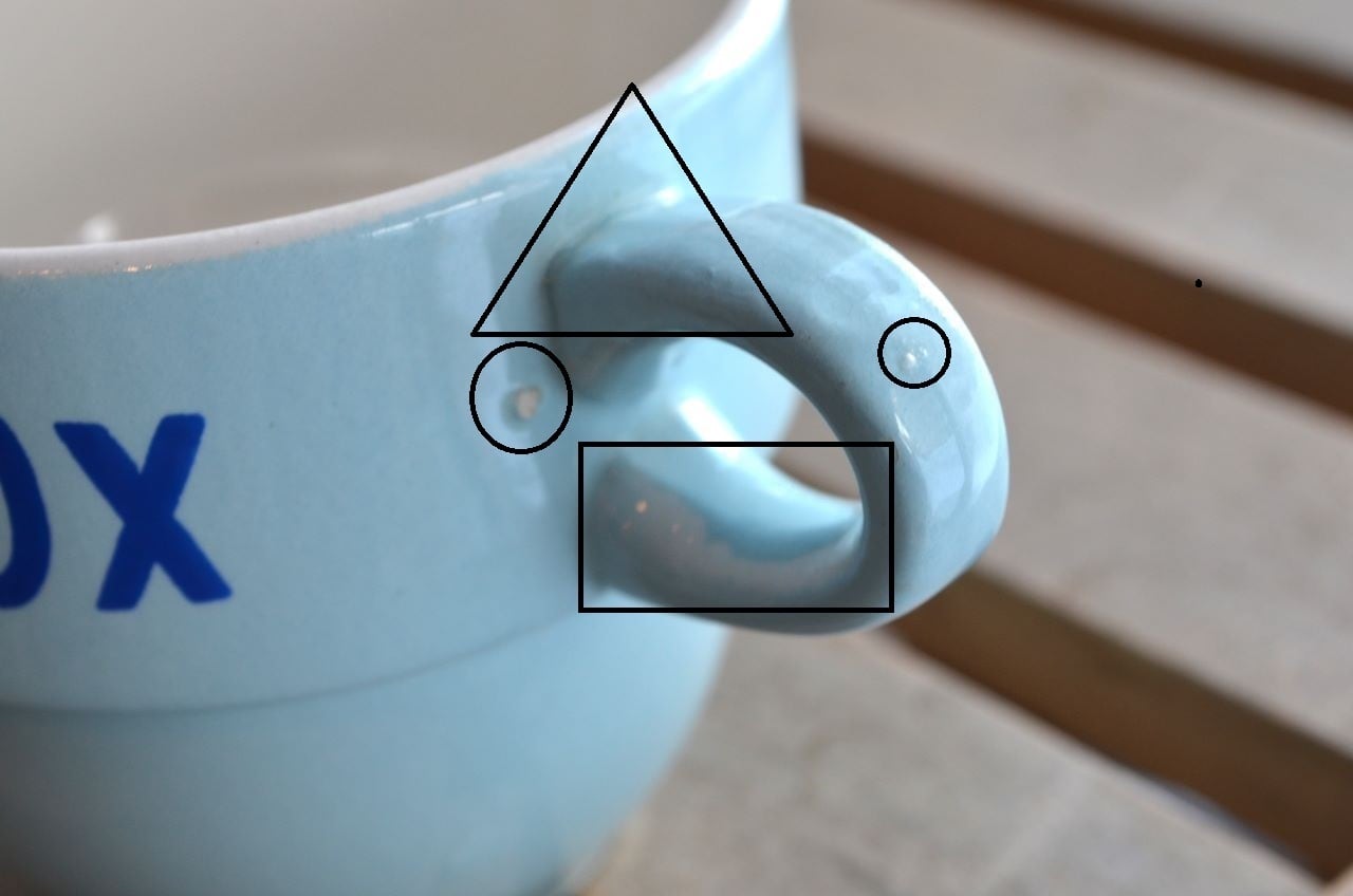 コンディション : 経年による、シミ、キズ、汚れ、貫入などあり、裏側の底に1か所小さなカケがありますが気にならないと思います。又、写真6の〇は、製造時に付いた凸で、左側は上がカケて白くなっています。同じ写真6の▭は製造時の色の塗り残しで、△はヒビが入っていますが、現段階では問題はありませんでした。但し、気になる方はご遠慮ください。尚、写真5の〇は少し滲みが出ています。全体的には良好と思います。