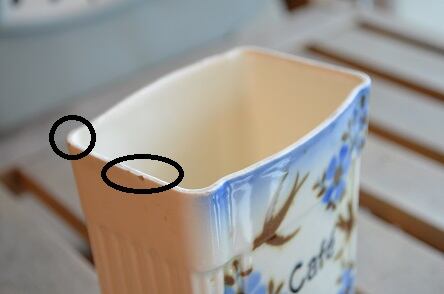 コンディション : 経年による、シミ、キズ、汚れ、貫入などあります。又、本体上部リムに擦れ感と若干の小さなカケ(写真3,4)がありますが、蓋には目立ったカケはありません。全体的には大変綺麗で良好と思います