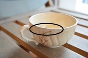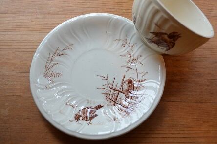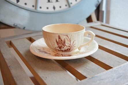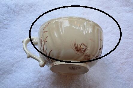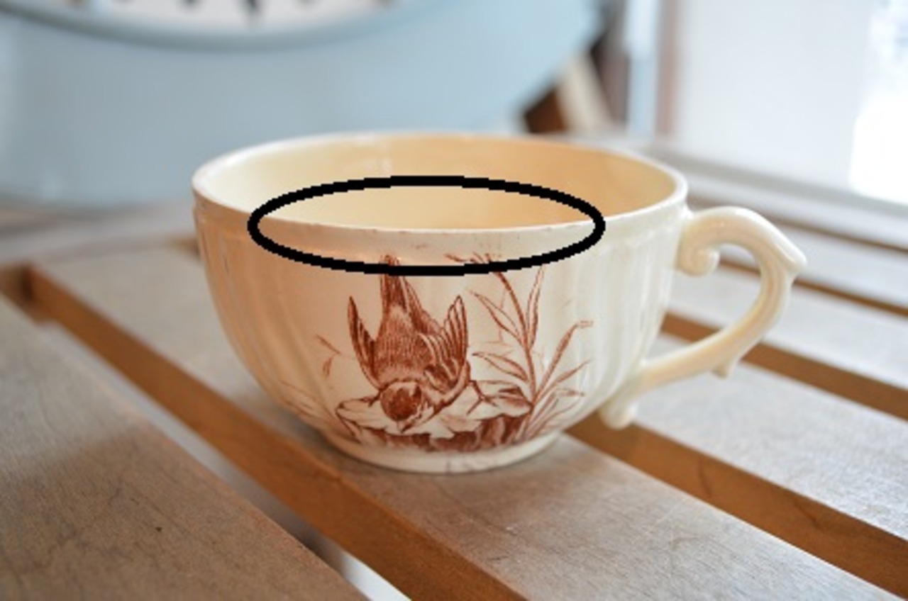 コンディション : 経年による、シミ、キズ、汚れ、貫入などあり、特にシミ(写真5)は茶色に変色してカップの内側と外側を全体を通して広がっています。ただ、見方によっては上部にあるので、それ程気にならないかもしれません。尚、カップのリムに極小さなカケ(写真3,4)が数か所あり、擦れ感も若干あります。又、写真はありませんが、ソーサーのリムにも1か所極小さなカケがありますが、こちらは目立たず、気にならないと思います。全体的には、大変レアなカップ&ソーサーで、悪くはないと思いますが、気になる方はご遠慮ください