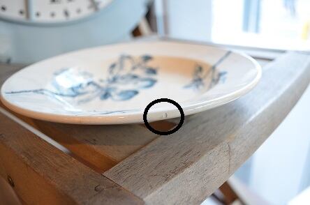 コンディション : 経年による、シミ、キズ、汚れ、貫入などあり、特にシミは広範囲にあります。リムに1か所(写真4)とリム内側に1か所(写真3)カケがあります。全体的には良好と思いますが、シミが気になる方はご遠慮ください