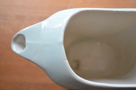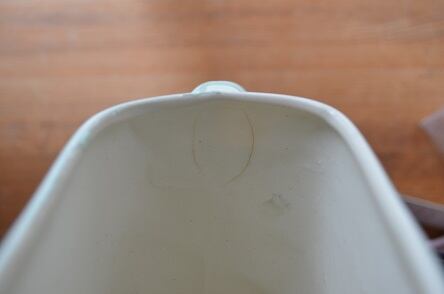 コンディション : 目だった汚れや、シミ、キズなどありませんが、上部に1ヶ所小さなチップ(写真2)があります。又持ち手の上部の穴(写真3)は、製造過程で付いたものと思います。又、外側にはありませんが、内側持ち手上部分(写真4)にヒビがあり、外側持ち手下部分(写真5)は貫入かと思います。現段階では問題ないと思いますが、お水など沢山は入れない方が良いと思います。薄い水色が大変素敵なレアな一品かと思います