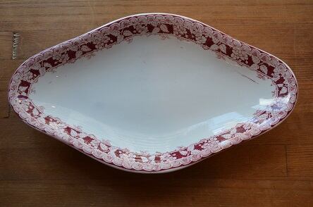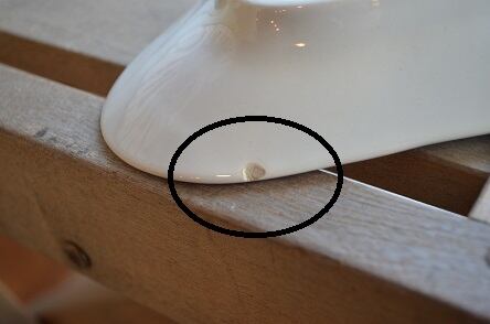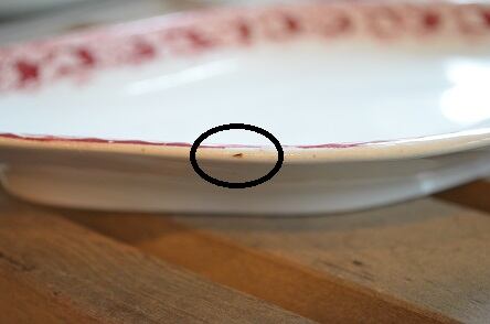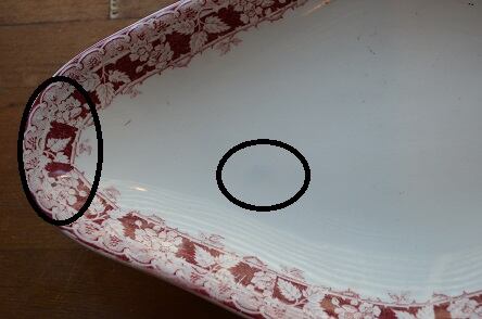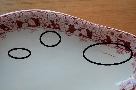 コンディション : 経年による、シミ、キズ、汚れ、貫入などあり、リムに1か所小さなカケ(写真5)と、製造時に付いたと思われるカケの上に釉薬を塗った部分があります。又、裏側リムに0.5×0.5cm程のカケ(写真4)がありますが、どれもあまり目立ちません。尚、表面に製造時に付いた凸に若干黒ずみ(写真2右〇)が見られ、色が飛んでる部分(写真3)もあります。又、転写シートのつなぎ目(写真2左〇)が上下左右の角にあります。全体的には良好と思います