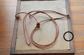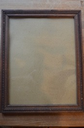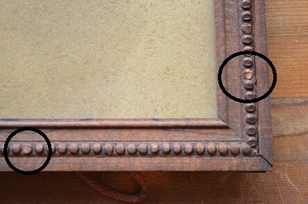 コンディション : 経年による、シミ、キズ、汚れなどあり、又、周りの飾り部分のカケ(写真2,3)などがあります。尚、裏側部分が板木はなく、厚紙になっていて、抑える部分の釘は上下1か所ずつ、左右2か所ずつですが、右側の下(写真4)が取れてます。全体的にはとても素敵なフレームだと思います