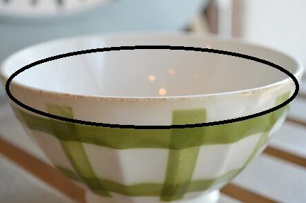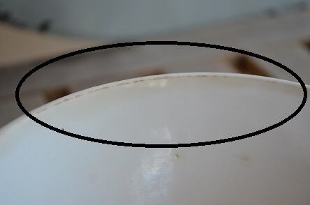 コンディション : 経年による、シミ、キズ、汚れ、貫入などあり、又、リムにカケ(写真2上〇と写真3,4)がかなりあり、そこが変色しています。全体的には悪くはないと思いますが、気になる方はご遠慮ください。尚、側面のリム下に製造時に付いたブラックの線(写真2下〇)があります