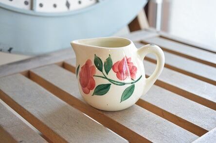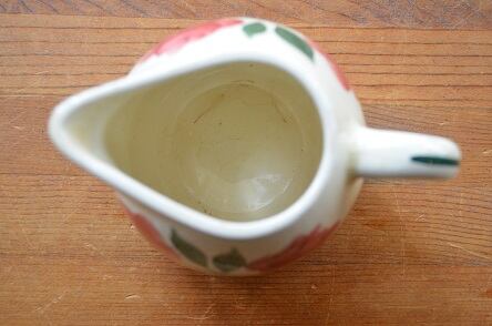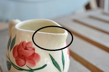 コンディション : 経年による、シミ、キズ、汚れ、貫入などあり、特にシミは注ぎ口の下部(写真3)と本体下部(写真5)にありますが、どちらも陰になってそれ程気にならないと思います。又、注ぎ口リムに小さなカケが数か所(写真2)ありますが、こちらもあまり目立たないと思います。全体的には大変かわいらしいピッチャーです