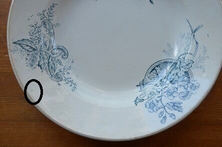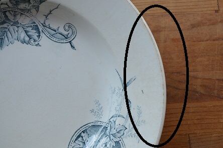 コンディション : 経年による、シミ、キズ、汚れ、貫入などあり、特にシミは表面とリム(写真4)にあります。又、リムにカケ(写真5)があり、黒くなっています。尚、写真3は窯キズと思われます。全体的には悪くはないのですが、気になる方はご遠慮ください