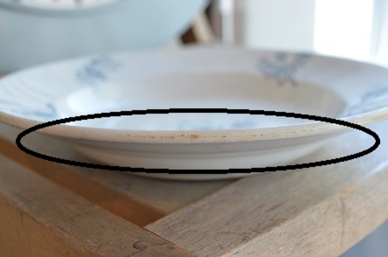 コンディション : 経年による、シミ、キズ、汚れ、貫入などあり、特に表面とリムにシミがあります。又、リムに擦れ感はありますが、目立ったカケはありません。尚、写真3左〇は窯キズと思われ、同じく写真3右〇は釉薬の塗り残し部分です。全体的には悪くはありませんが、気になる方はご遠慮ください
