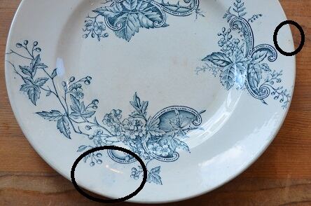 コンディション : 経年による、シミ、キズ、汚れ、貫入などあり、特に表面にシミがあります。又、リム内側にカケ(写真3上〇)があり、リムに窯キズ以外にカケ(写真4)が数か所あり、若干の擦れ感もあります。尚、写真2は、窯キズと思われます。又、製造時に付いたブルーの色飛び(写真3下〇)も見られます。全体的には良好と思います